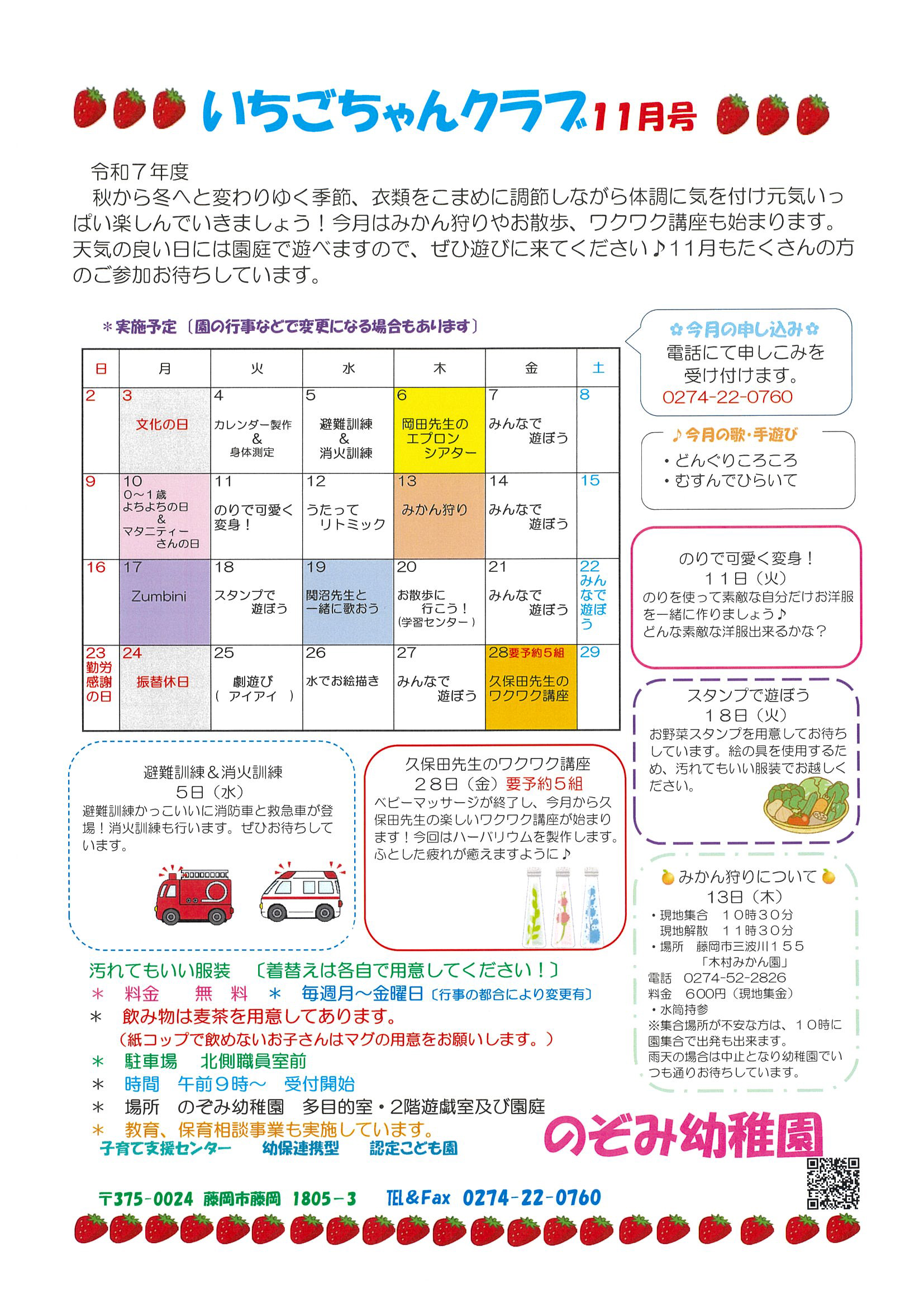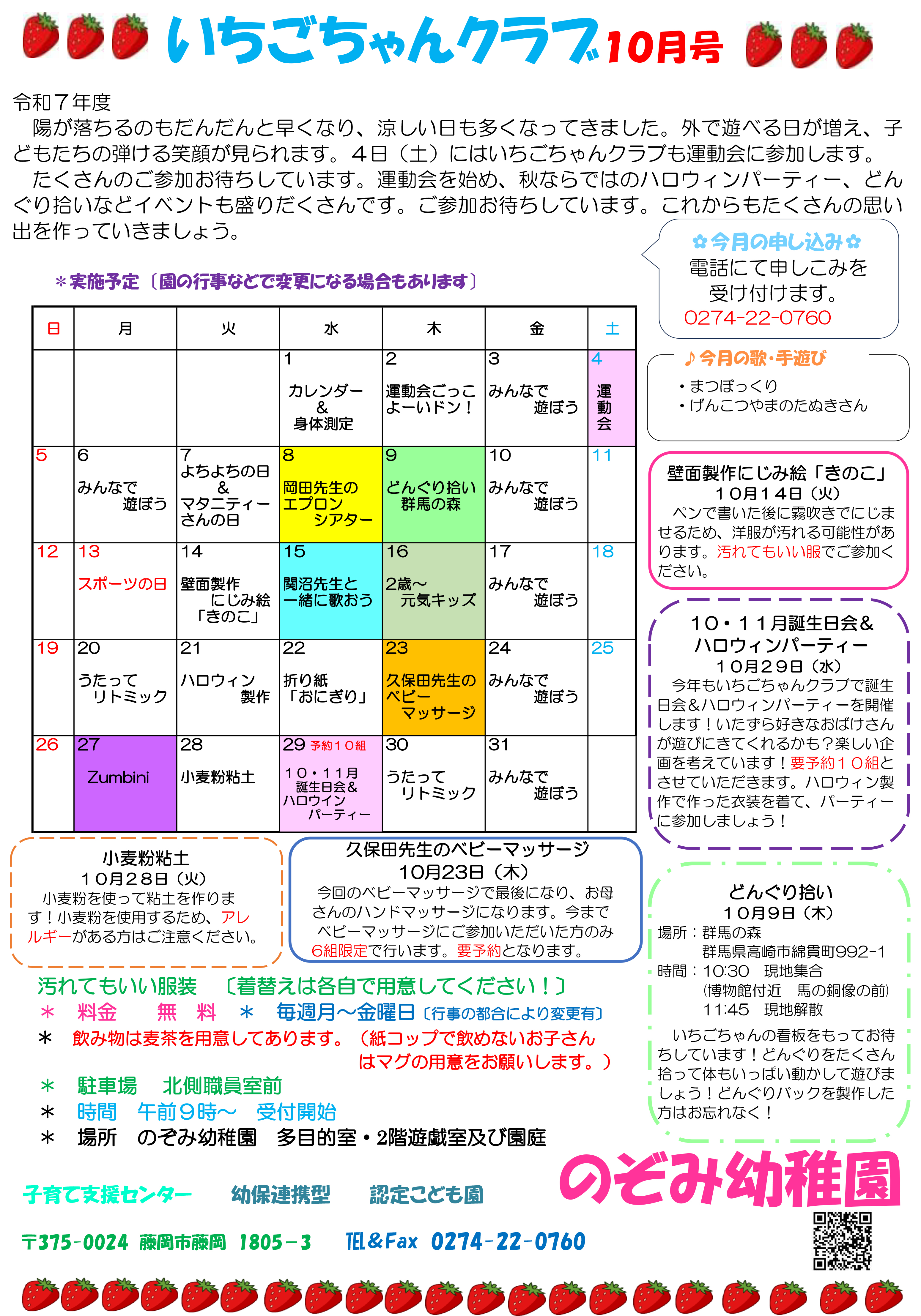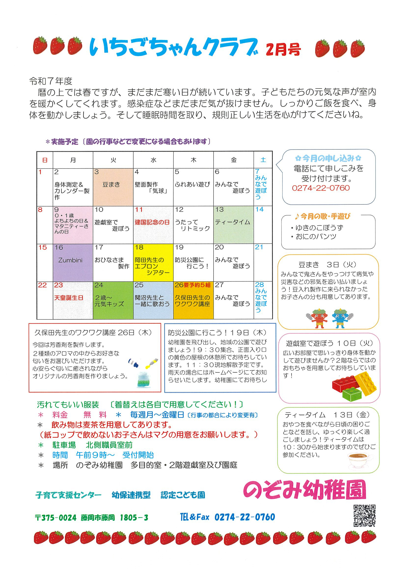 のぞみ幼稚園は、保護者の子育て不安や負担感を解消し、安心して子どもを生み育てられる、子育て環境を作るために協力します。< いちごちゃんクラブ > は、親子で楽しむ未就園児の幼児教育体験です。 以下に実施予定表を掲示します。